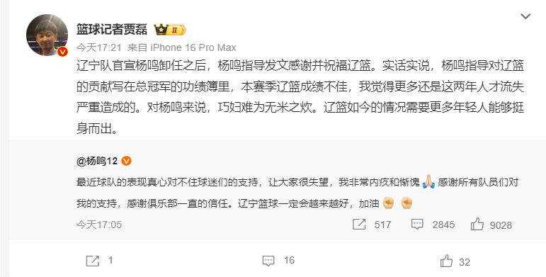 大V们纷纷不满辽篮管理层的做法,他们认为杨鸣沦为了俱乐部的替罪羊: